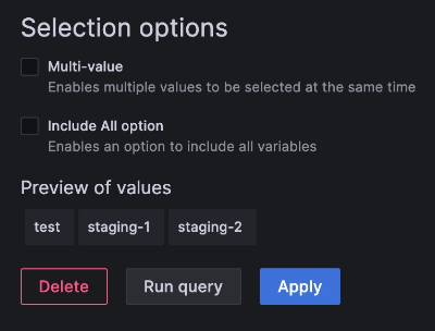 In the next example, we perform an integration test where we test a plugin's entire variable query data flow. For successful variable queries, the resulting options are displayed at the bottom of the variable edit page. You can use the matcher toDisplayPreviews to assert that the expected previews are displayed.