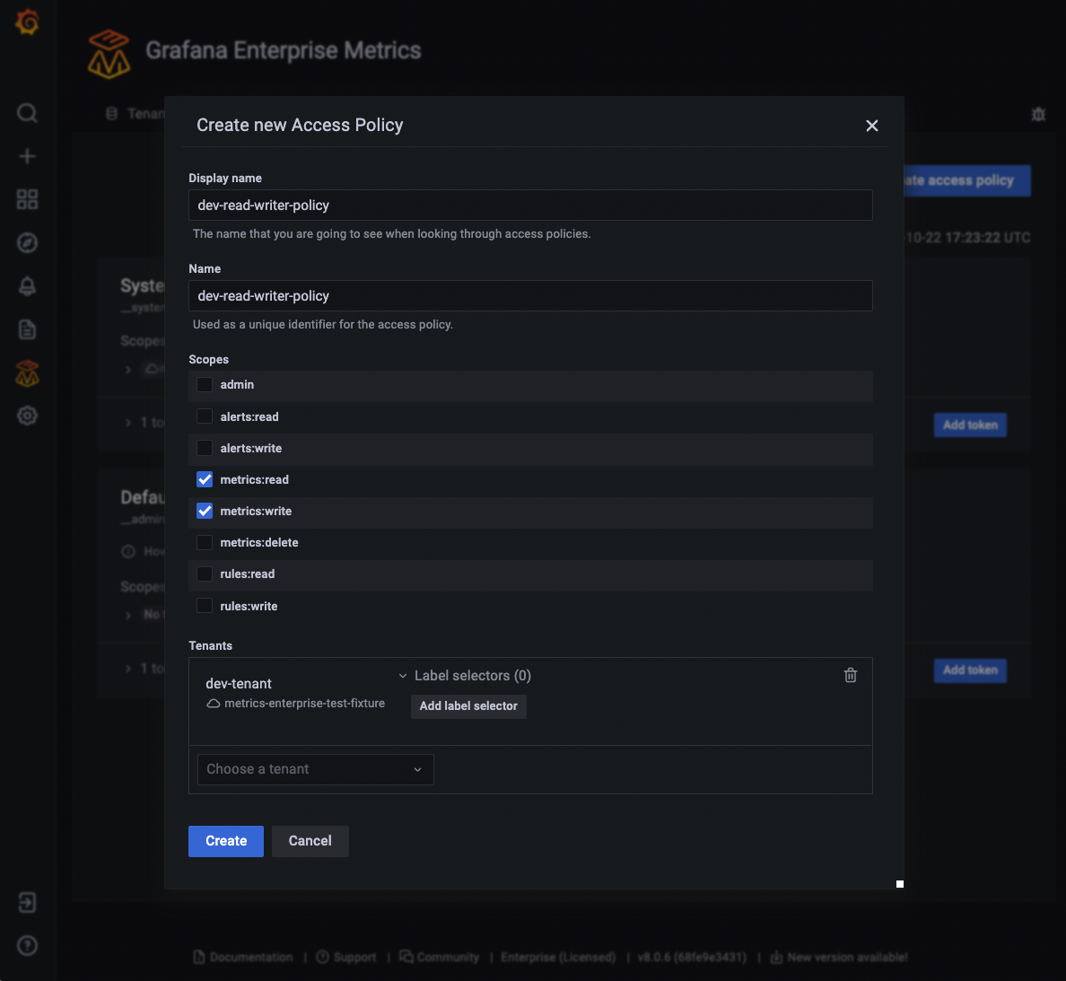 1. Navigate to Grafana Enterprise Metrics > Access policies.