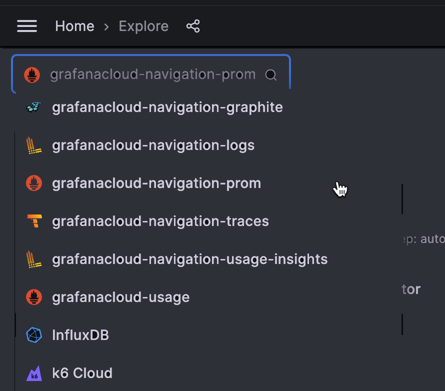 Using the data sources dropdown, select the data source corresponding to your Cloud Prometheus metrics endpoint. Its name will be grafanacloud-your_stack_name-prom: