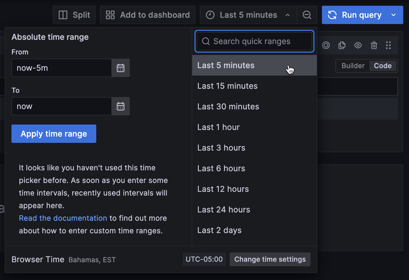 Once you’ve selected the correct data source, change the time window for the query to Last 5 minutes: