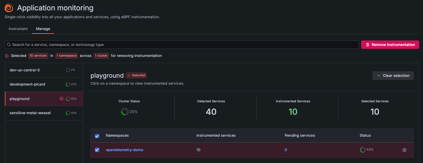 - Select individual services: Select the Cluster, select the checkbox next to the namespace, and click Remove Instrumentation.