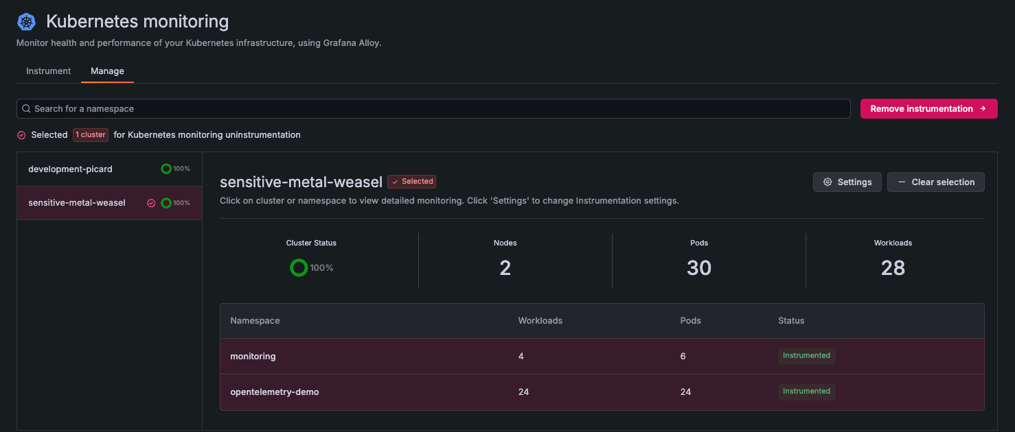You can remove instrumentation from any Cluster in the Manage tab.