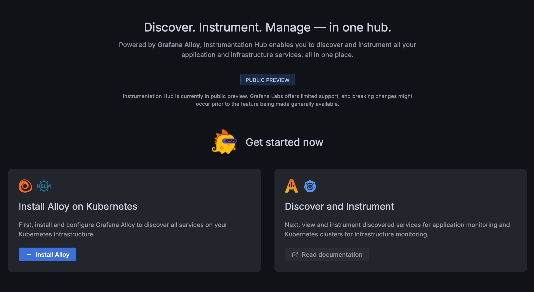 Instrumentation Hub is an initial setup and configuration tool within Grafana Cloud. With Instrumentation Hub, you can: