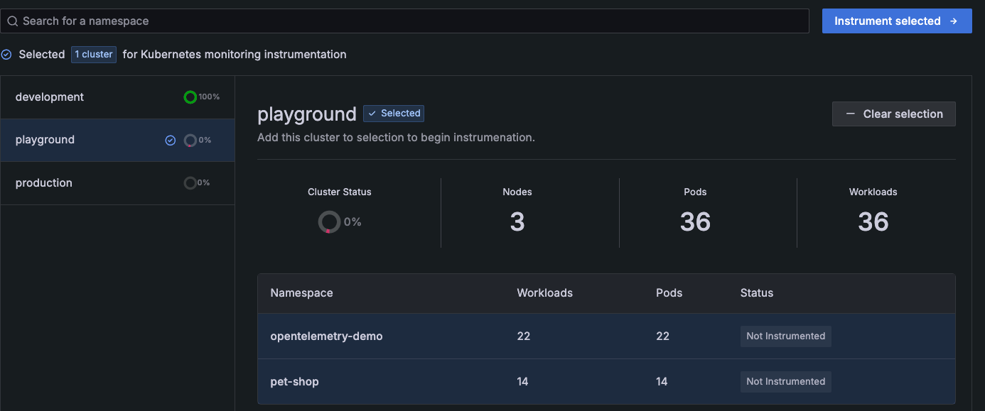 ![All uninstrumented Clusters and their namespaces selected for instrumentation All uninstrumented Clusters and their namespaces selected for instrumentation]()