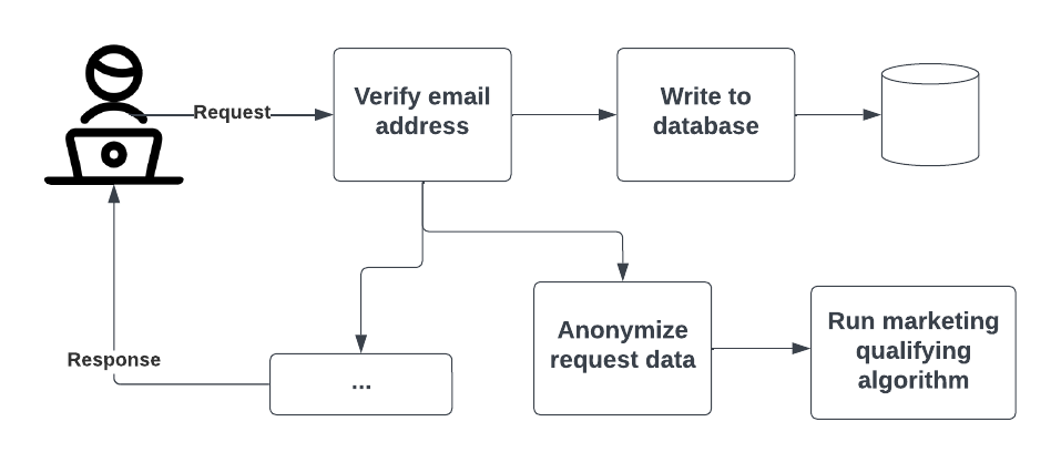 A trace provides end-to-end insight because it tracks a system request as it travels through multiple locations/components of a system that is distributed or based on microservices. Traces are made up of spans. Spans record how long each part of a request takes, such as this simple request shown in the following process diagram.