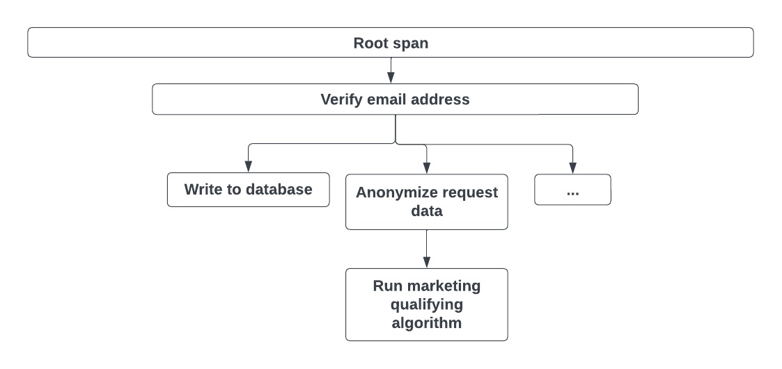 The following graphic shows the root span that records the length of the entire request. A root span has child spans for each part of processing the request.