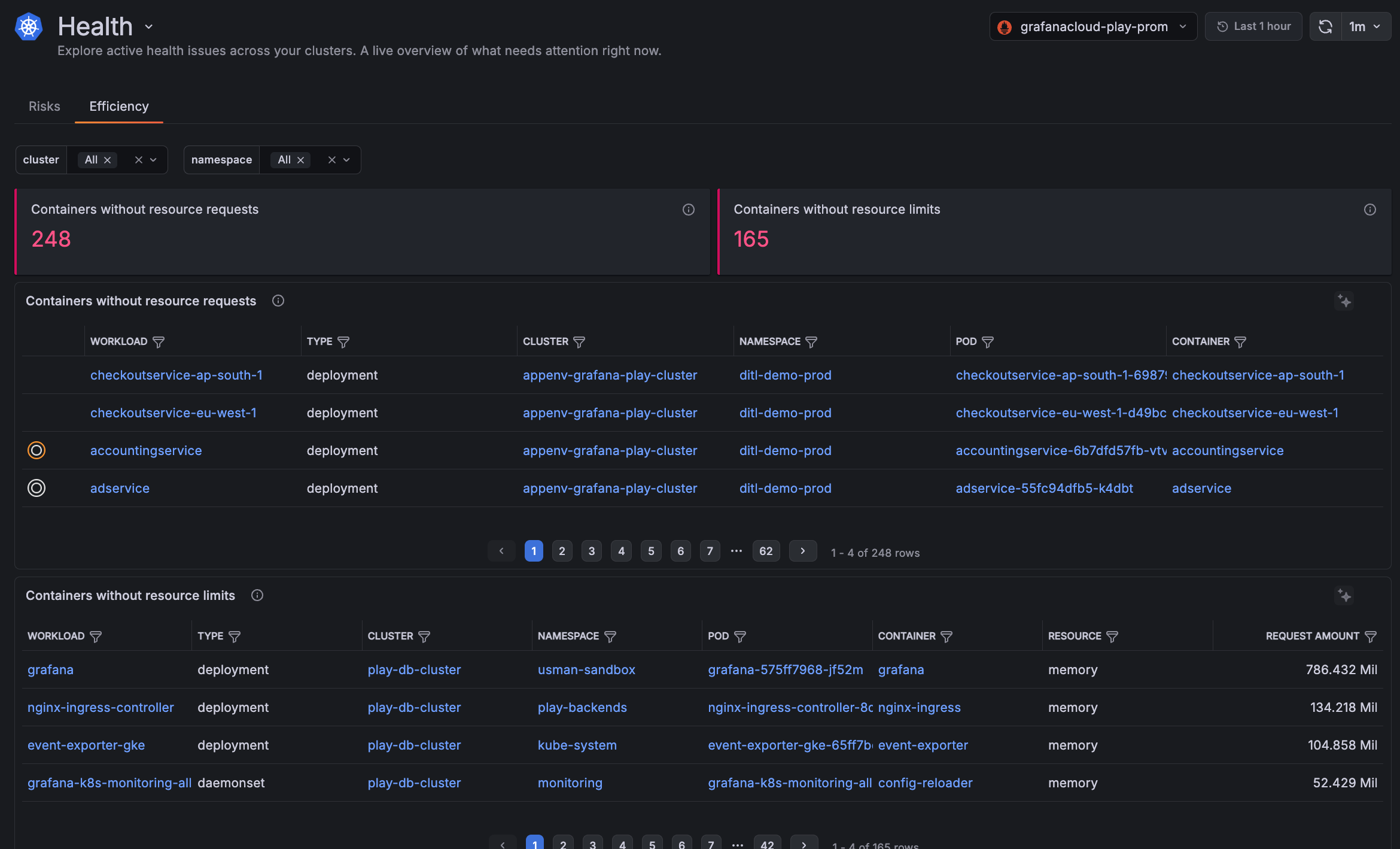 Use the Efficiency tab on the Health page to find containers with resource configuration gaps or significant over-provisioning.