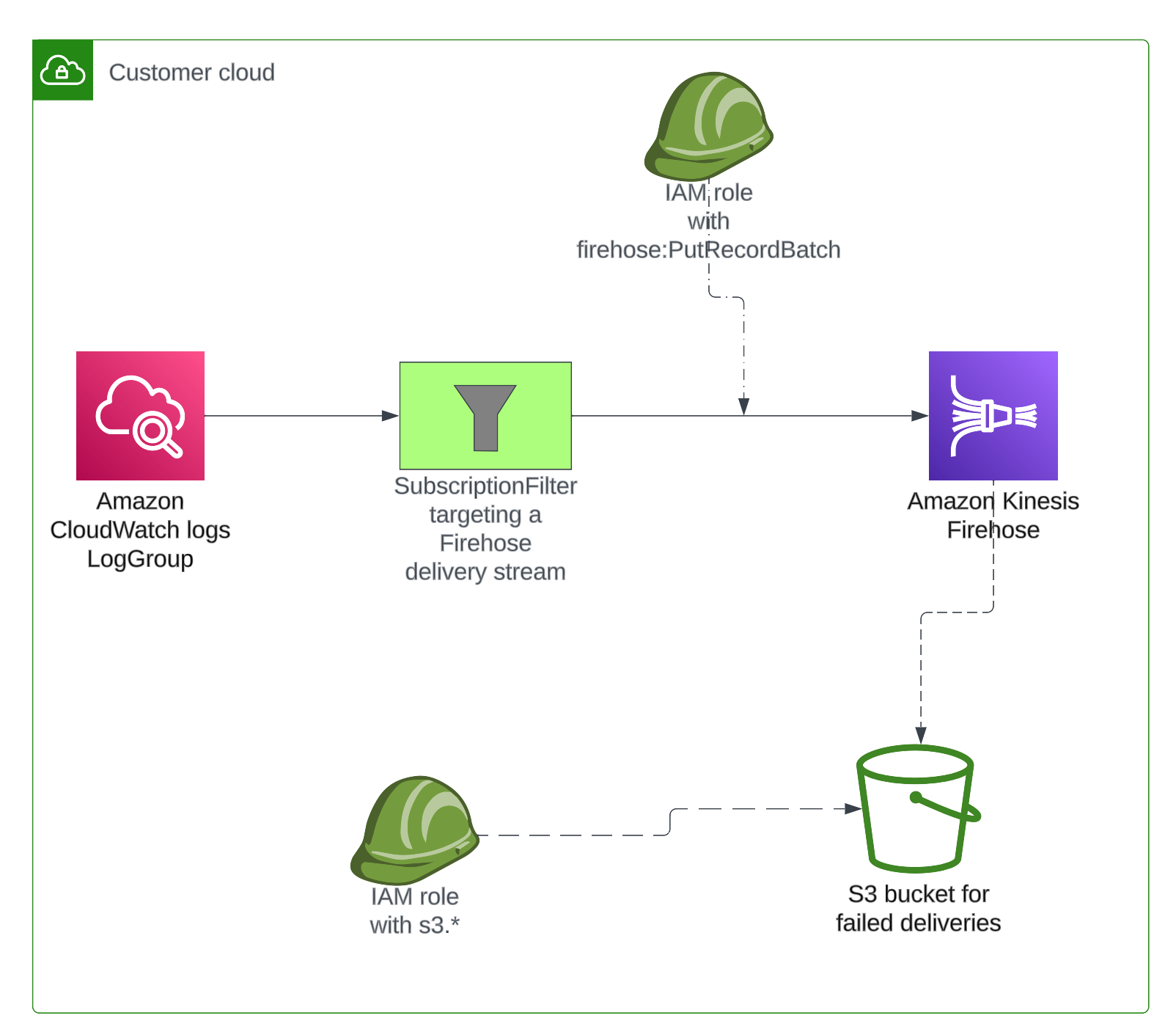 RoleArn: "<IAM Role for sending logs ARN, created in the steps above>"FilterPattern: An optional filter expressionLogGroupName: The log group the logs should be sent fromDestinationArn: ARN of the Data Firehose delivery stream, created in the previous stepsRoleArn: ARN of the IAM role for sending logs, created in the previous steps