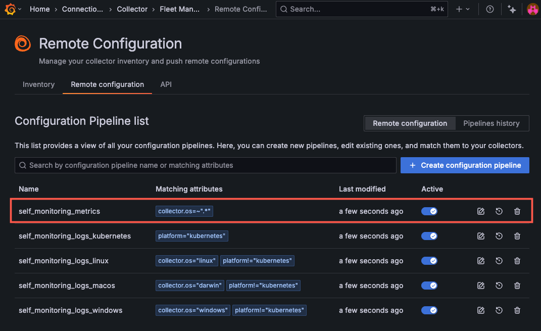 1. Check if the self_monitoring_logs_* configuration pipeline is in the Configuration Pipeline list and is enabled. The Fleet Management application automatically creates pipelines for Linux, macOS, Windows, and Kubernetes. The logs pipeline assigned to your collector depends on its operating system.
