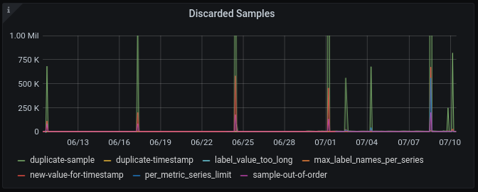 This graph can help you detect problems, but sometimes you need to investigate further to locate the source of an issue. For example, the dashboard doesn’t show series reporting 0 discarded samples. To learn more about the reasons for discarded samples, refer to Ingest problems.