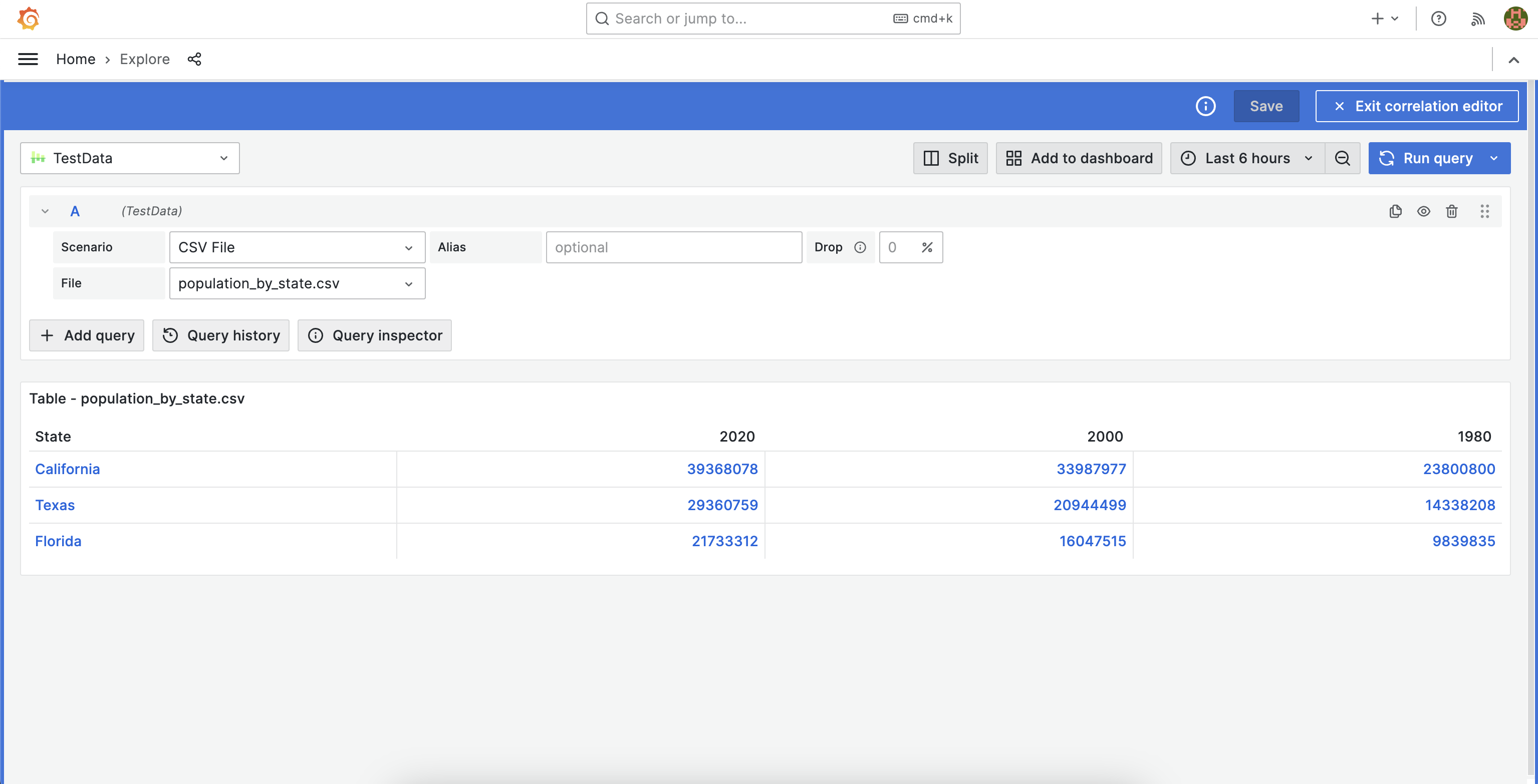 After the correlation is saved, Explore will rerun the query in the left pane. By clicking a state name, the query on the right is rerun with values from the row being inserted into the CSV, thus changing the graph. The query is rerun with updated values every time you click on a state name.