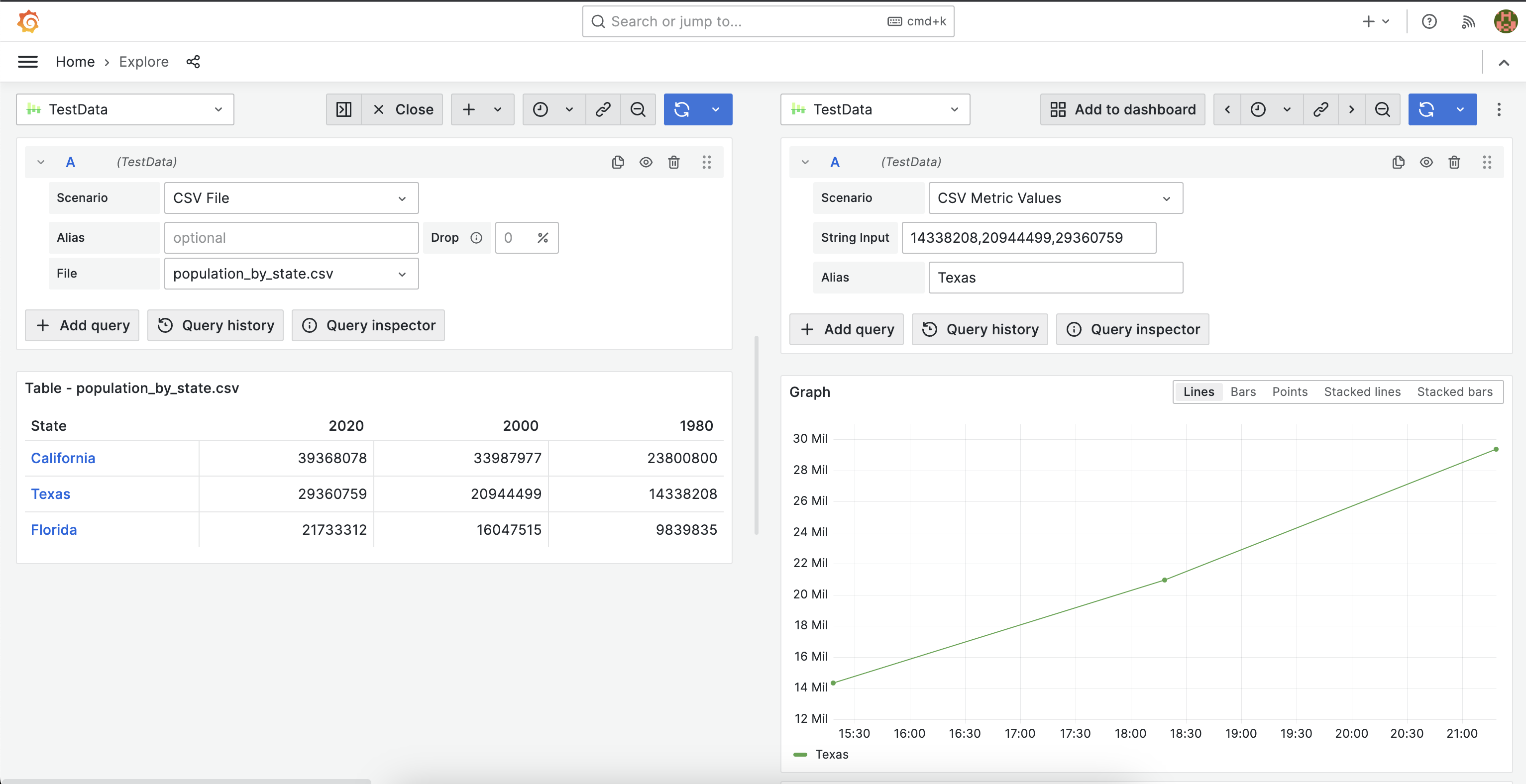 9. In the Scenario menu, select CSV Metric Values. The String Input field in the Query editor provides variables with population values for each year: ${1980},${2000},${2020}. This will generate a graph using variable values.
