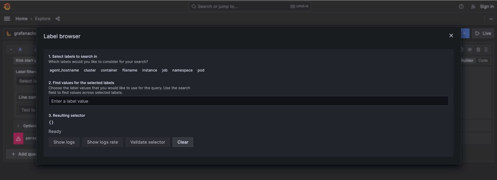 - Label browser - Use the Loki label browser to navigate through your labels and values, and build queries.