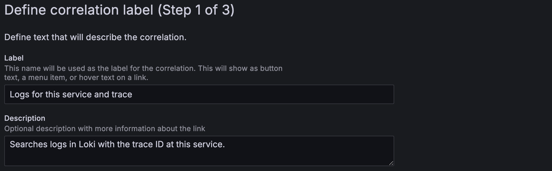 1. On step 1, add a new correlation with the label Logs for this service and trace and an optional description.