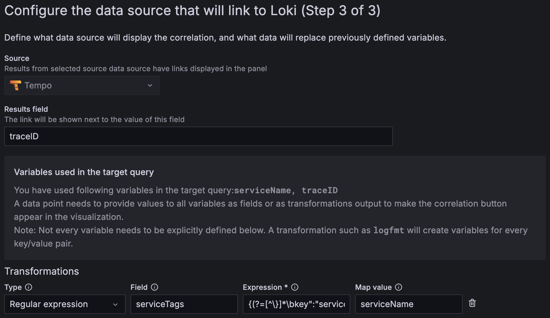 • Define the Loki query, using serviceName and traceID as variables derived from the span data: