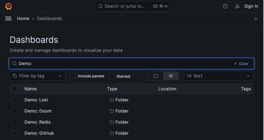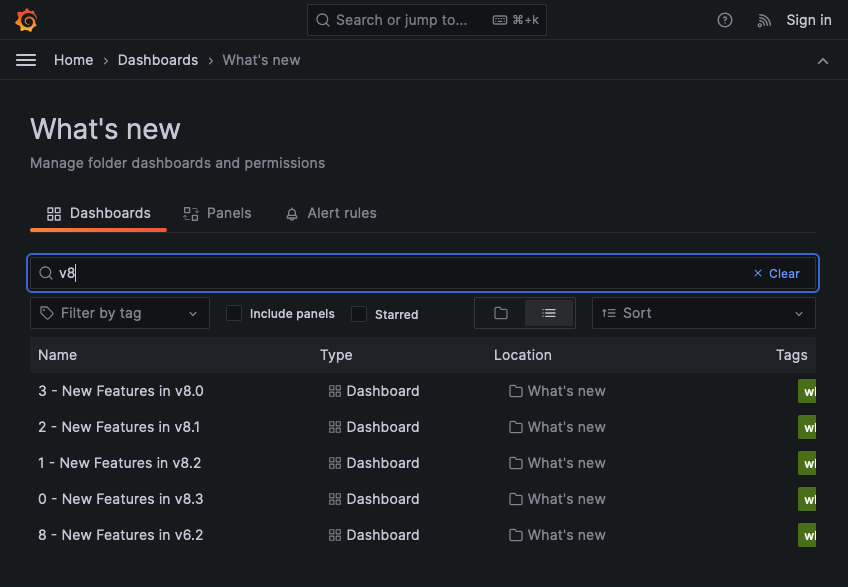 When you select multiple tags, Grafana shows dashboards that include all selected tags.