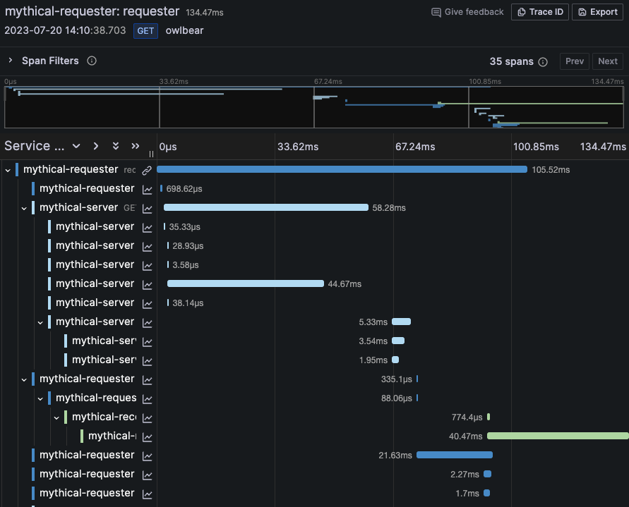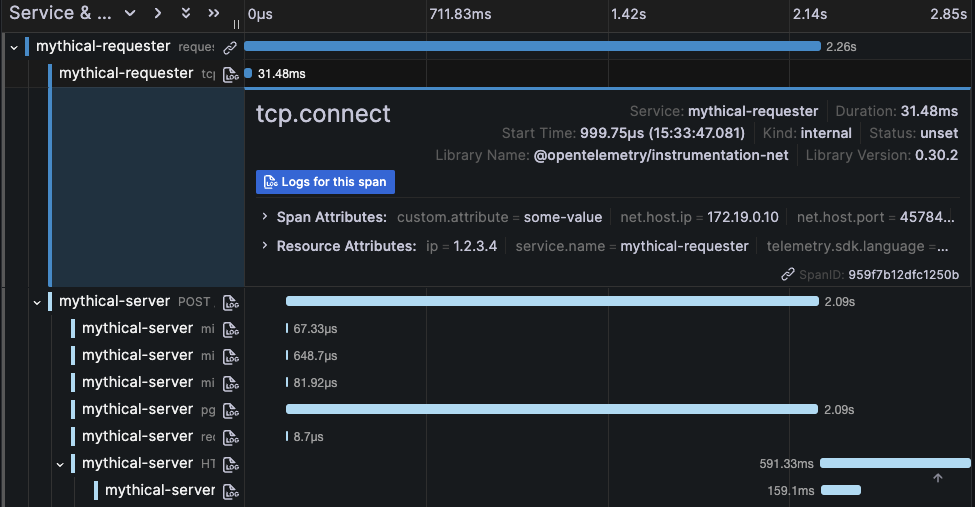 - Span duration bar - Visual representation of the operation duration within the trace.