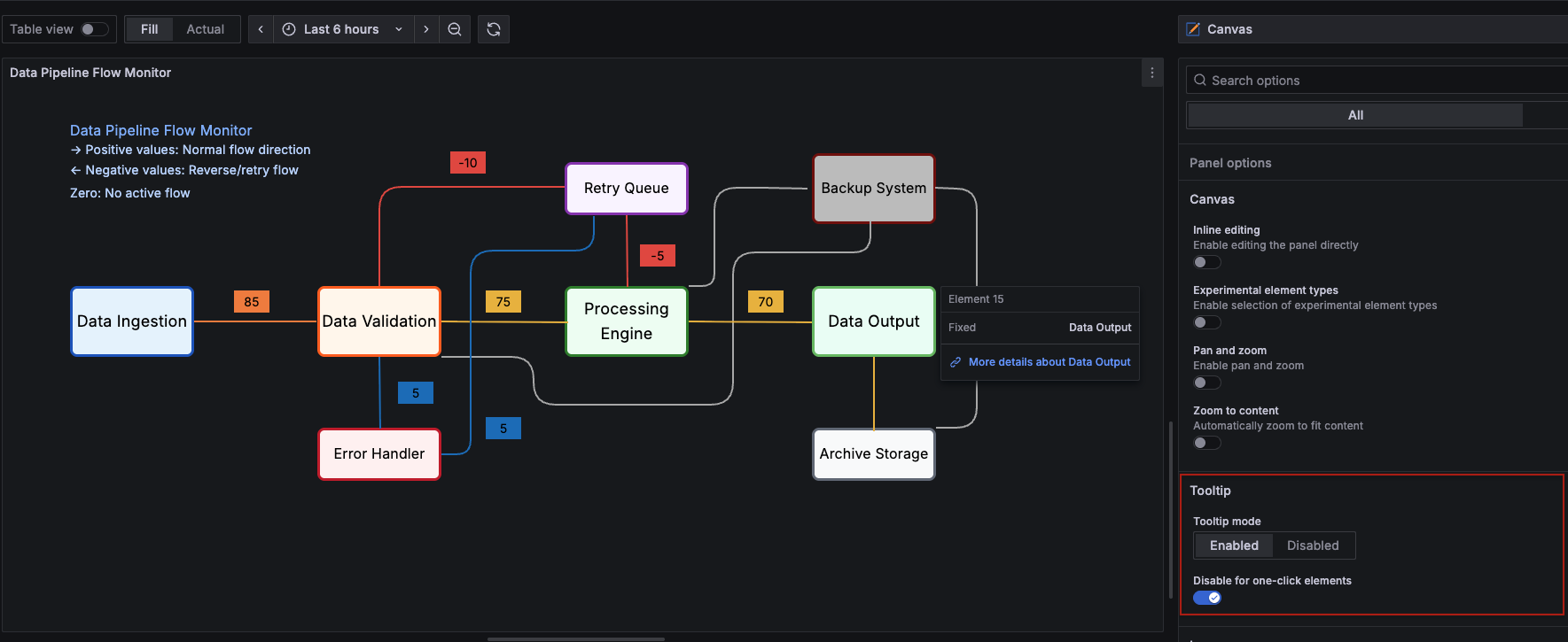 You can now choose to enable or disable tooltips in canvas visualizations. The Tooltip mode setting controls the display of tooltips when hovering over elements in a canvas that are connected to data, data links, or actions.