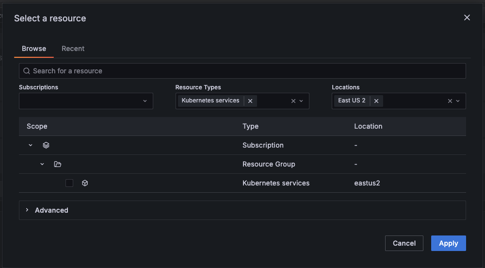 Azure Monitor Resource picker filtering and recent resources