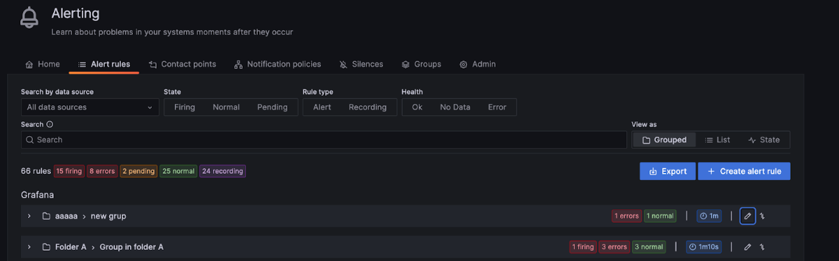 View the evaluation interval more easily from the grouped view on the Alert list page. The view now also always displays recording and normal alert rules and highlights alert rule status in different colors.
