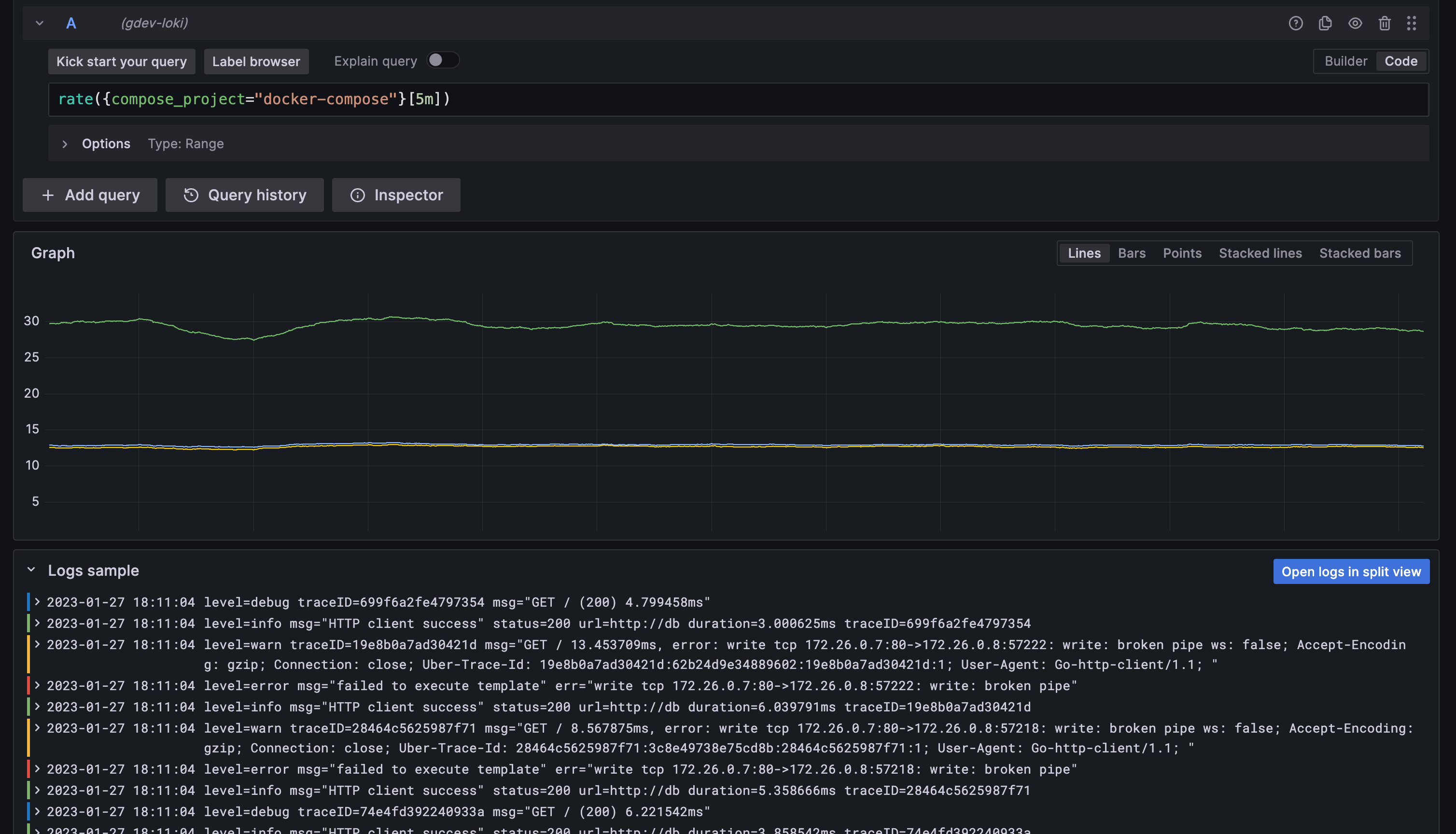 For Loki metric queries in Explore, you can now see the sample of log lines that contributed to the displayed results. To see these logs, click on the collapsed Logs sample panel under your graph or table panel. If you want to interact with your log lines or modify the log query, click on the “Open logs in split view” button and the log query will be executed in the split view.