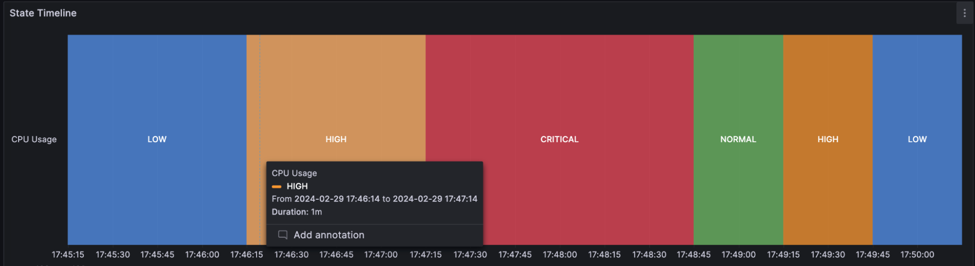 For example, if you’re monitoring the CPU usage of a server, you can use a state timeline to visualize the different states, such as “LOW,” “NORMAL,” “HIGH,” or “CRITICAL,” over time. Each state is represented by a different color and the lengths represent the duration of time that the server remained in that state: