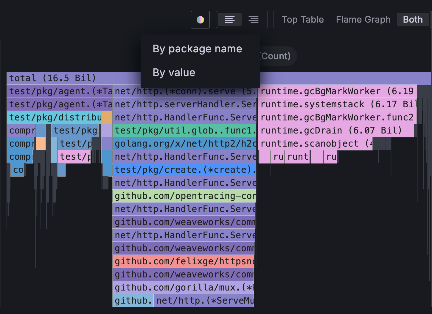 Visualization pickerChoose to show only the flame graph, only table, or both at the same time.