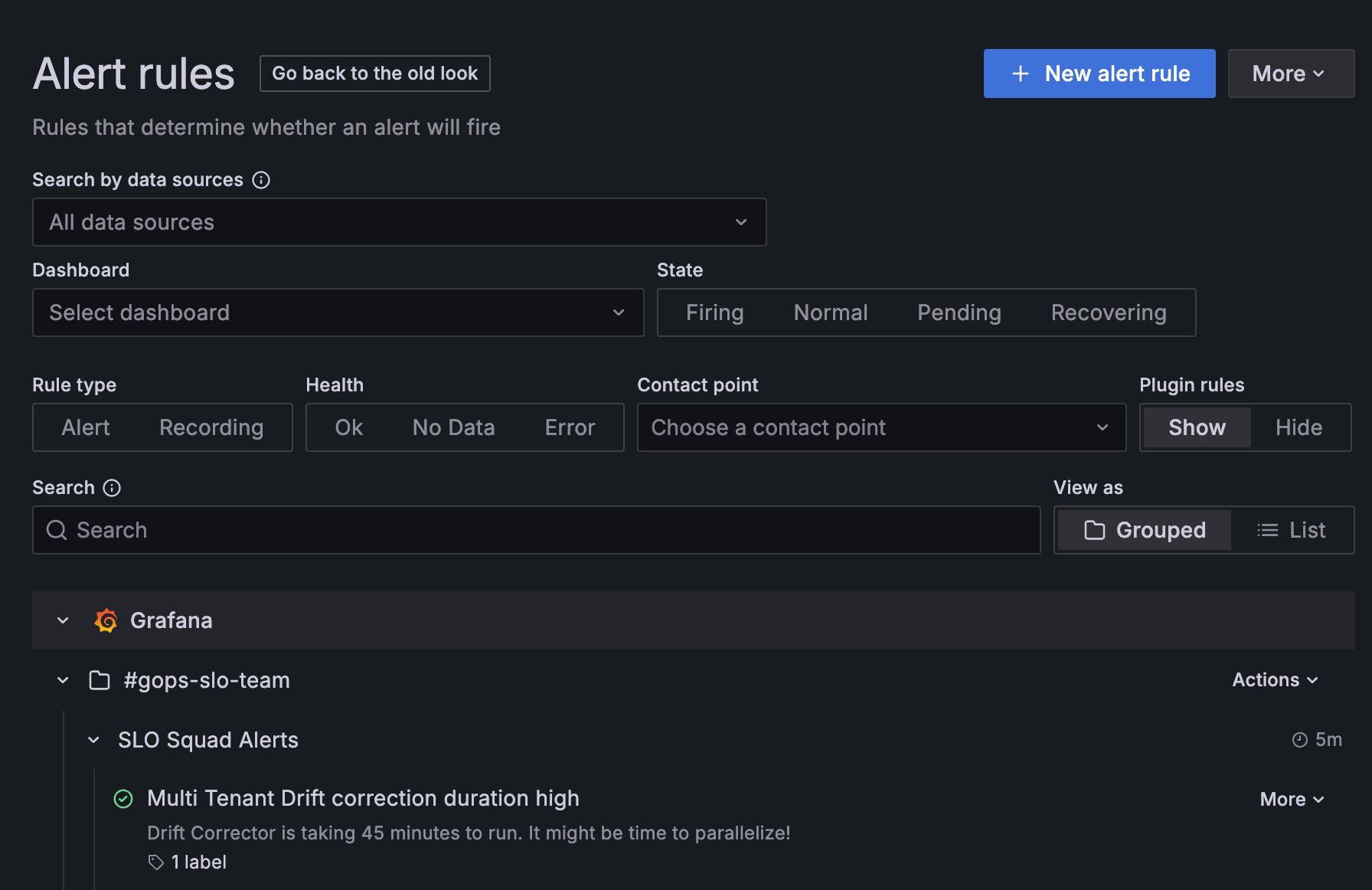 Grouped: Displays Grafana rules grouped in a hierarchical structure, from folder/namespace, to evaluation group, to the individual rules. This is the default view.