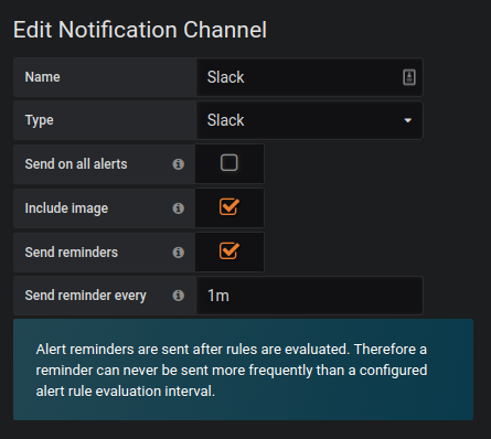 Important: Alert reminders are sent after rules are evaluated. Therefore a reminder can never be sent more frequently than a configured alert rule evaluation interval.