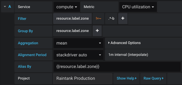 The Stackdriver query editor allows you to select metrics, group/aggregate by labels and by time, and use filters to specify which time series you want in the results.