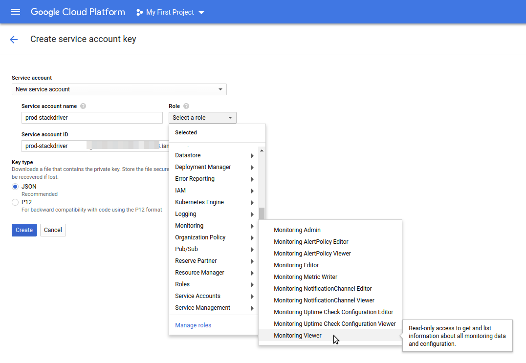 Choose role Click the Create button. A JSON key file will be created and downloaded to your computer. Store this file in a secure place as it allows access to your Stackdriver data.