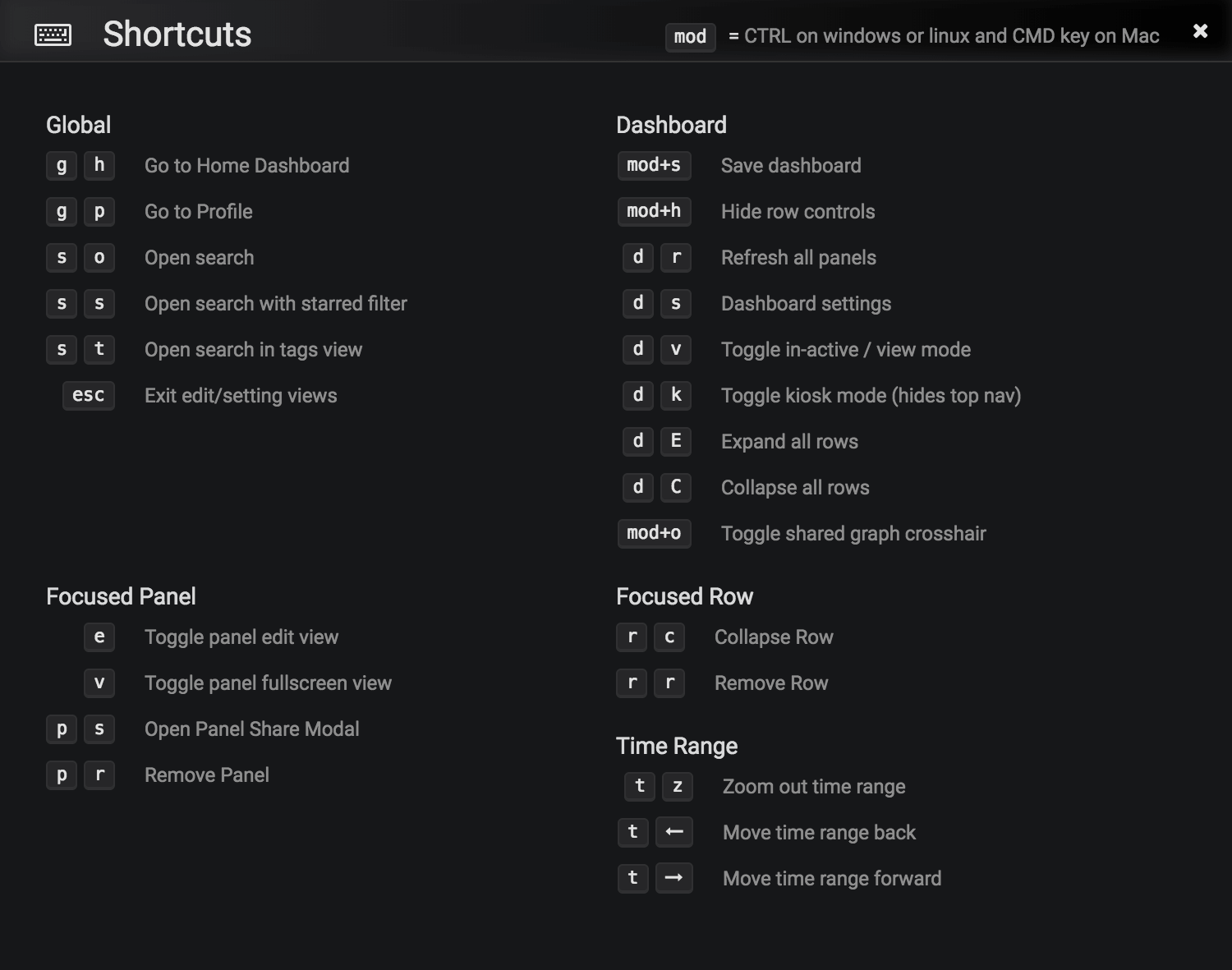 mod+sSave dashboardmod+hHide row controlsdrRefresh all panelsdsDashboard settingsdvToggle in-active / view modedkToggle kiosk mode (hides top nav)dEExpand all rowsdCCollapse all rowsmod+oToggle shared graph crosshair