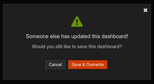 Grafana v2.0 protects Users from accidentally overwriting each others Dashboard changes. Similar protections are in place if you try to create a new Dashboard with the same name as an existing one.