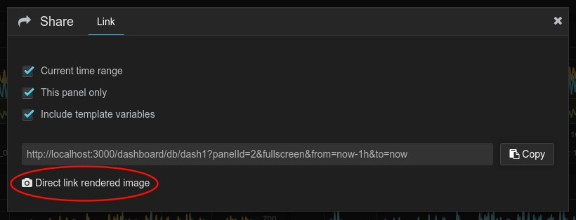 Grafana now supports server-side PNG rendering. From the Panel share dialog you now have access to a link that will render a particular Panel to a PNG image.