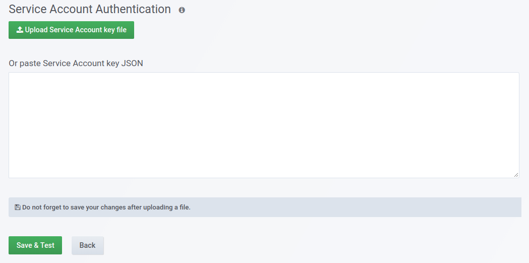 Upload service key file to Grafana The file contents will be encrypted and saved in the Grafana database. Don’t forget to save after uploading the file!