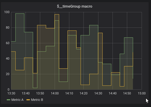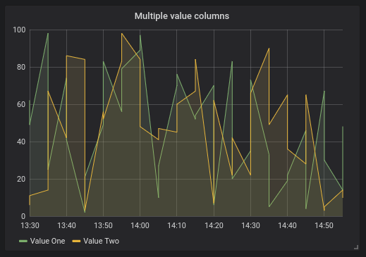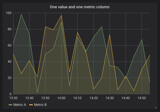 ORDER BY 1When the above query is used in a graph panel, it will produce two series named Metric A and Metric B with the values valueOne and valueTwo plotted over time.
