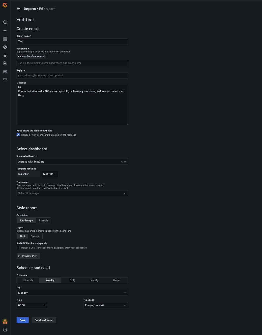 Reporting allows you to automatically generate PDFs from any of your dashboards and have Grafana email them to interested parties on a schedule. This is available in Grafana Cloud Pro and Advanced and in Grafana Enterprise.