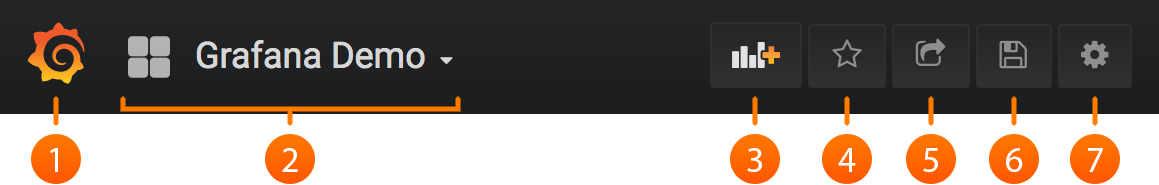 - Side menubar toggle (1): This option toggles the side menu. It provides access to features unrelated to a dashboard such as users, organizations, data sources, and alerting.