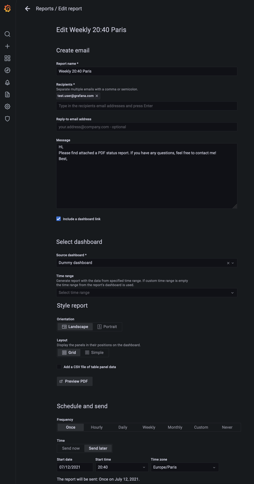 The last saved version of the report will be sent to selected emails. You can use this to verify emails are working and to make sure the report is generated and displayed as you expect.