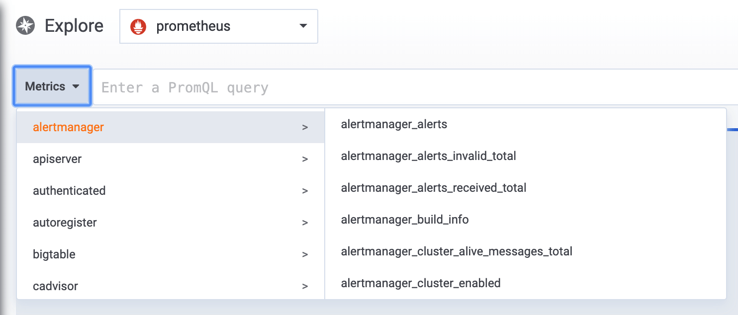 On the left side of the query field, click Metrics to open the Metric Explorer. This shows a hierarchical menu with metrics grouped by their prefix. For example, all Alertmanager metrics are grouped under the alertmanager prefix. This is a good starting point if you just want to explore which metrics are available.