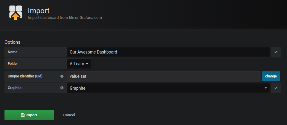 Grafana v5.2 adds support for specifying an existing folder or creating a new one when importing a dashboard - a long-awaited feature since Grafana v5.0 introduced support for dashboard folders and permissions. The import dashboard page has also got some general improvements and should now make it more clear if a possible import will overwrite an existing dashboard, or not.