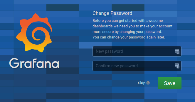 Starting from Grafana v5.2, when you login with the administrator account using the default password you’ll be presented with a form to change the password. We hope this encourages users to follow Grafana’s best practices and change the default administrator password.