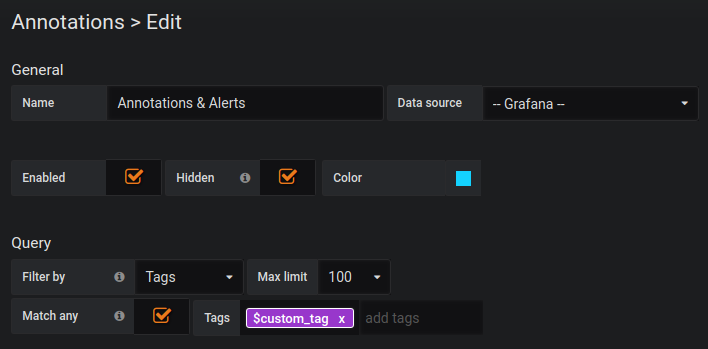 Grafana 5.3 brings improved support for native annotations and makes it possible to use template variables when filtering by tags. For more information about native annotation, refer to query by tag.