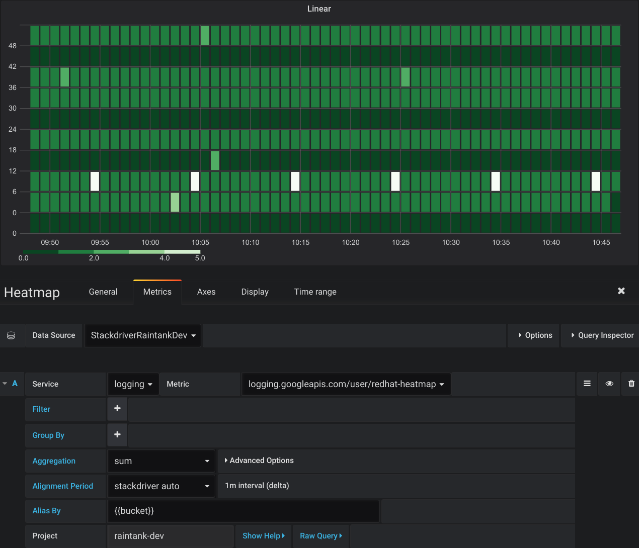 Getting started with the plugin is easy. Simply create a GCE Service account that has access to the Stackdriver API scope, download the Service Account key file from Google and upload it on the Stackdriver data source configuration page in Grafana and you should have a secure server-to-server authentication setup. Like other core plugins, Stackdriver has built-in support for alerting. It also comes with support for heatmaps and basic variables.