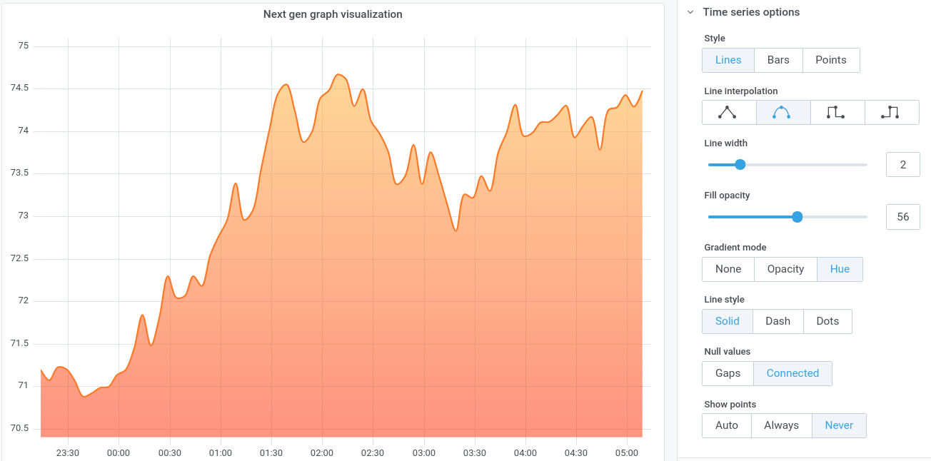 Grafana 7.4 adds a beta version of the next-gen graph visualization. The new graph panel, the Time series visualization, is high-performance visualization based on the uPlot library. This new graph visualization uses the new panel architecture introduced in Grafana 7.0 and integrates with field options, overrides, and transformations.