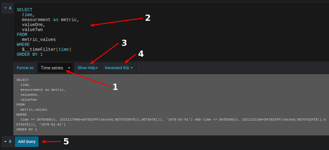 We’re mimicking the $__timeGroup(time, '5m') in the select and group by expressions and that’s why there’s a lot of lengthy expressions needed -