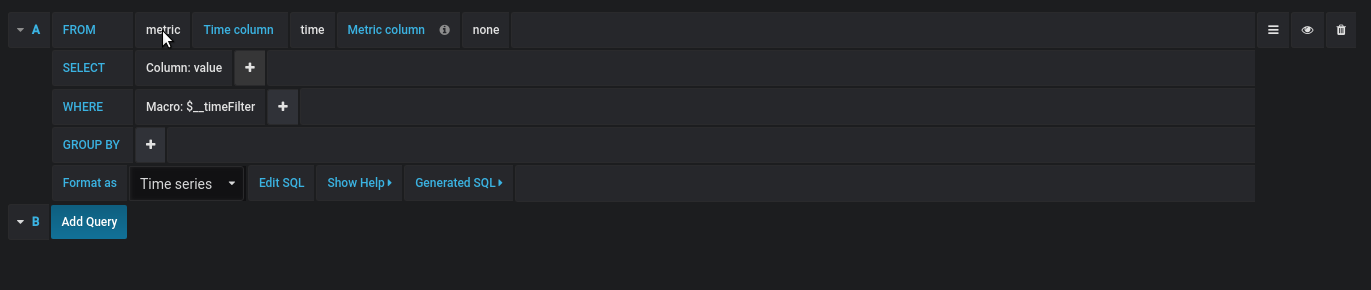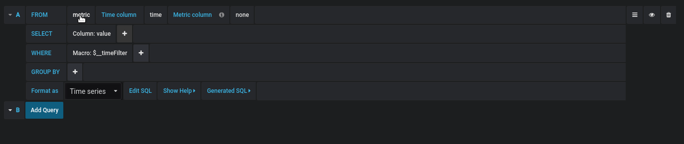 The Time column field refers to the name of the column holding your time values. Selecting a value for the Metric column field is optional. If a value is selected, the Metric column field will be used as the series name.