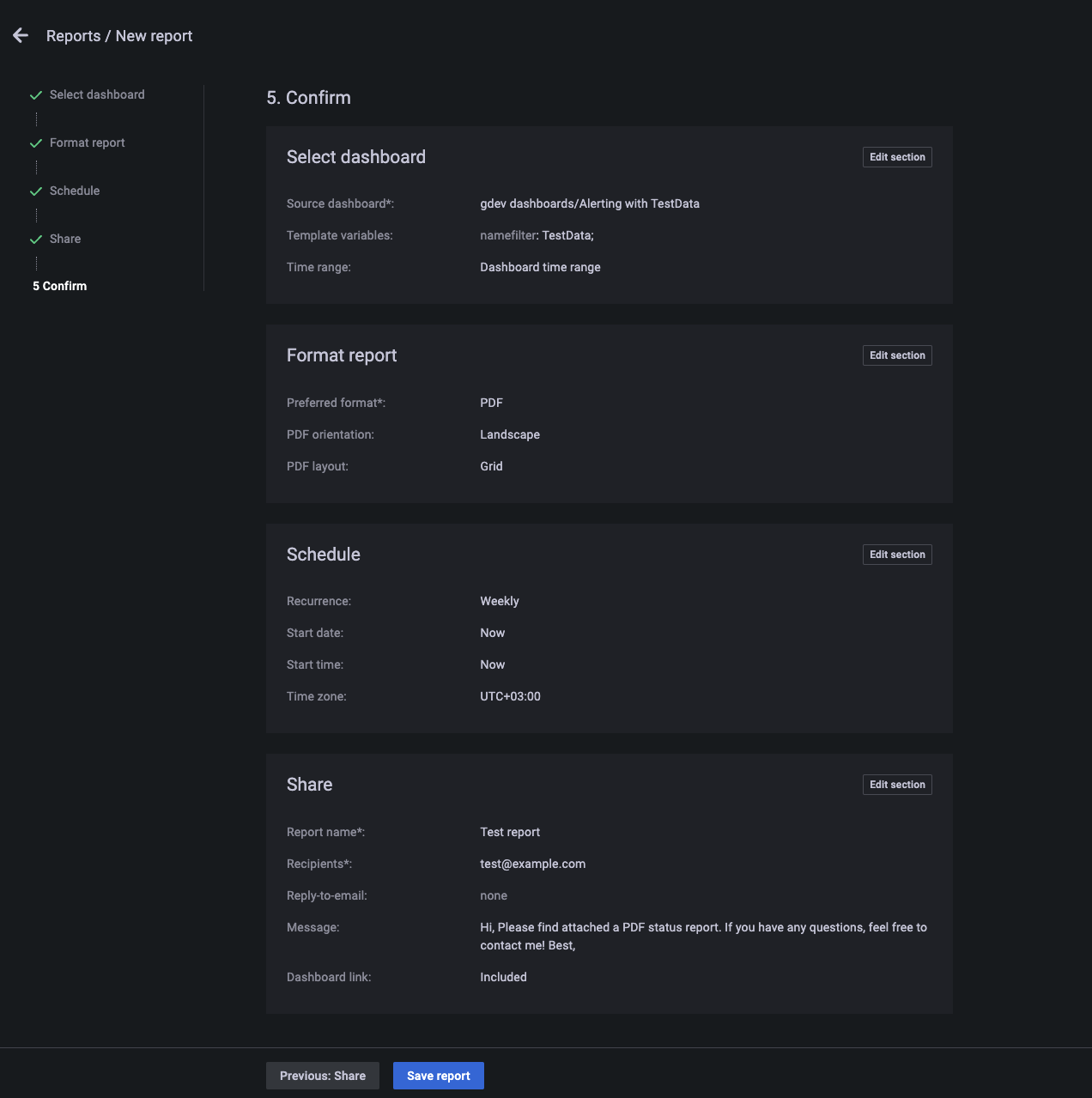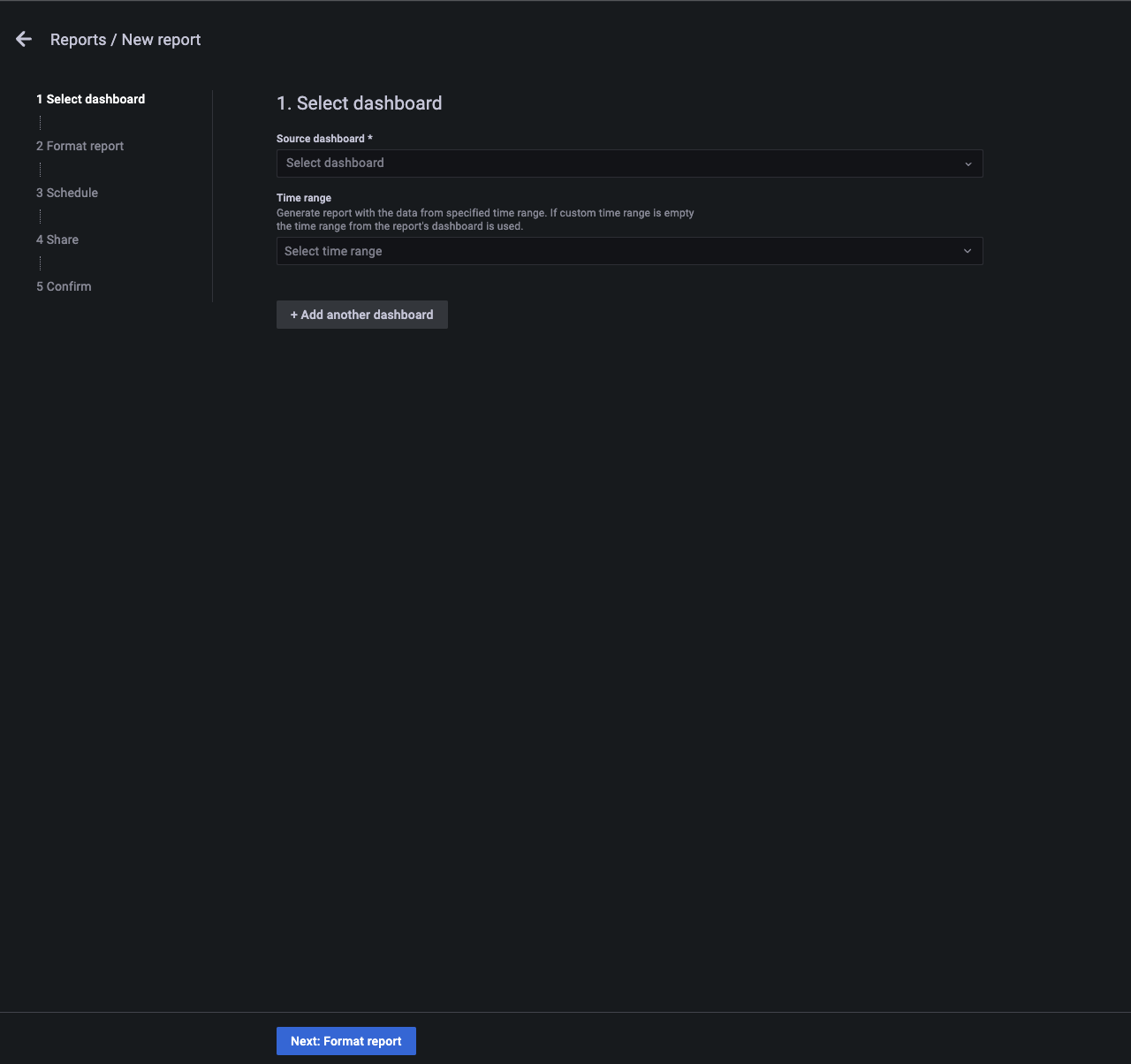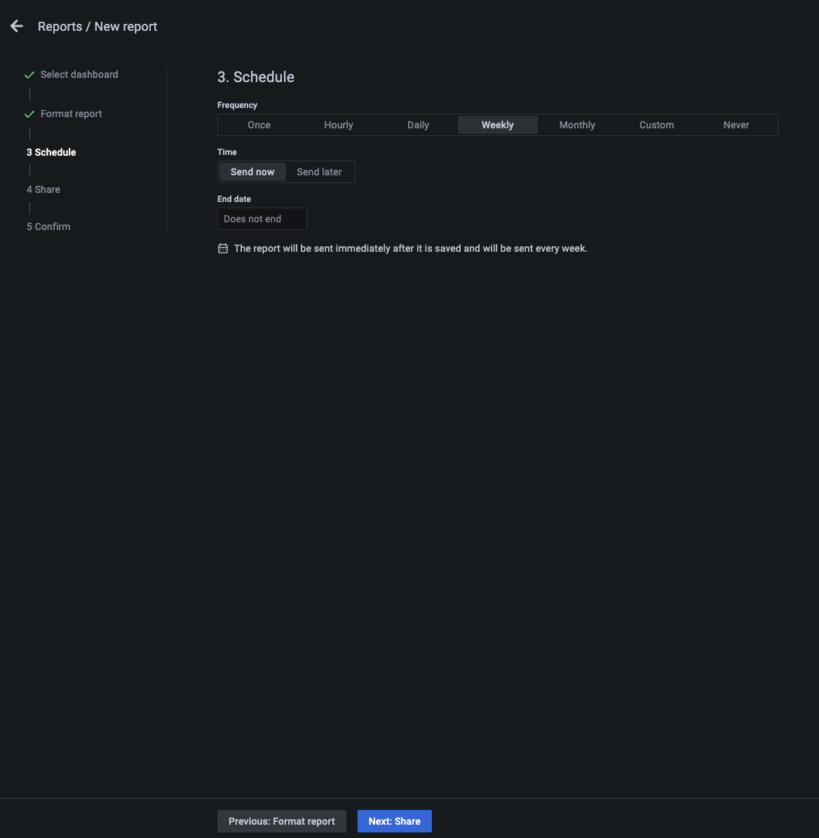 Note: You can set custom report time ranges in Grafana Enterprise 7.2+ and Grafana Cloud Pro and Advanced.