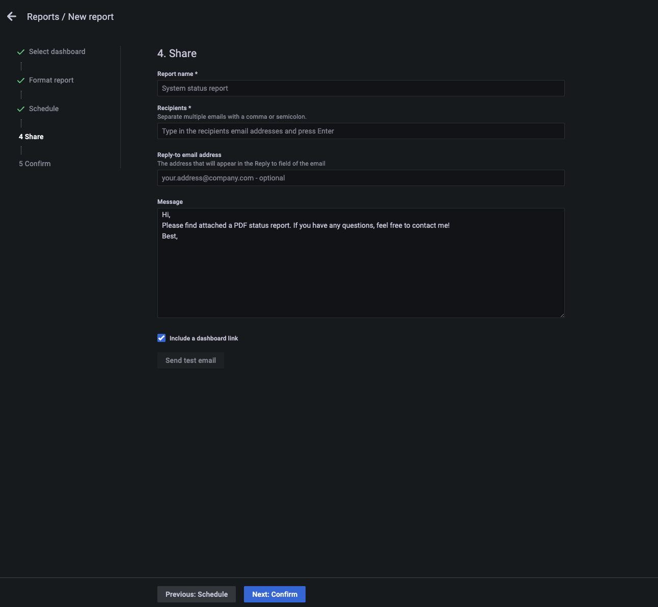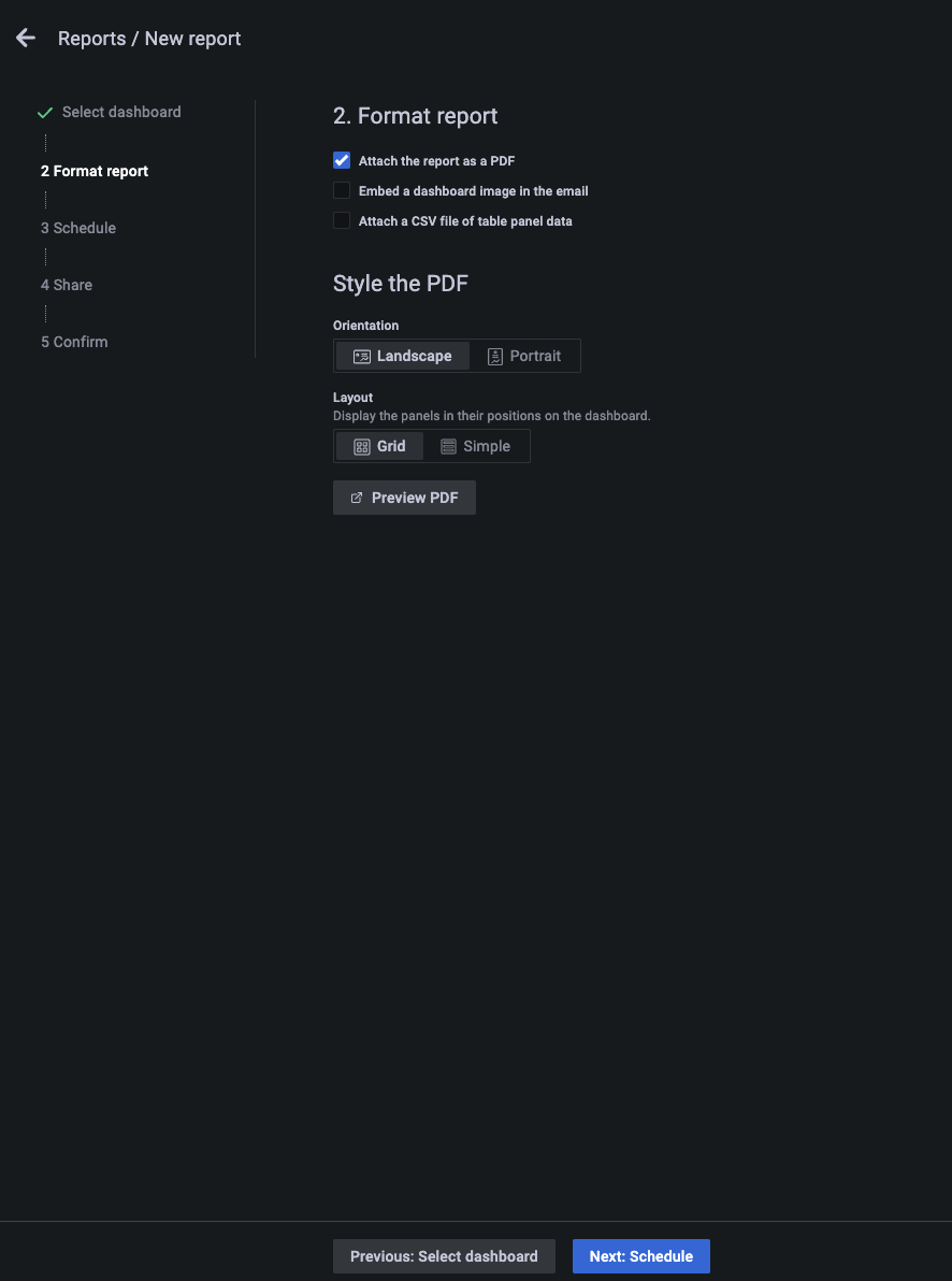 - Choose format options for the report - Select at least one option. Attach report as PDF, embed dashboard as an image, or attach CSV file of table panel data.