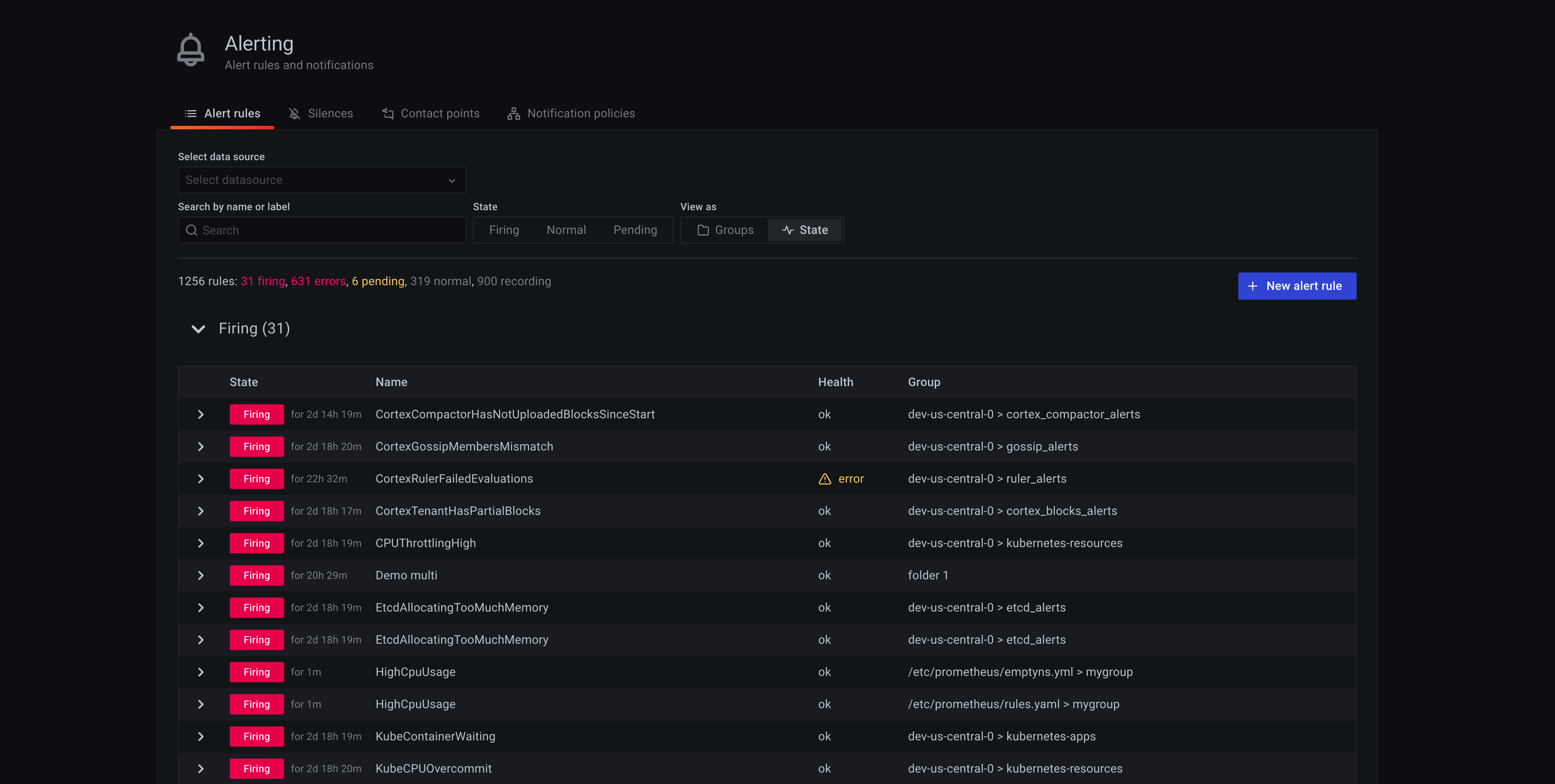 State view shows alert rules grouped by state. Use this view to get an overview of which rules are in what state. Each rule can be expanded to view its details. Action buttons and any alerts generated by this rule, and each alert can be further expanded to view its details.